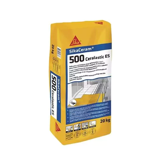 SikaCeram 500 Ceralastic es un mortero modifi cado a base de polímeros en base cementosa, flexible y monocomponente, con fibras sintéticas y resistencia a los álcalis, con áridos seleccionados de granulometría fina y aditivos específicos, para imperemeabilización y el pegado de cerámica sobre soportes tradicionales.